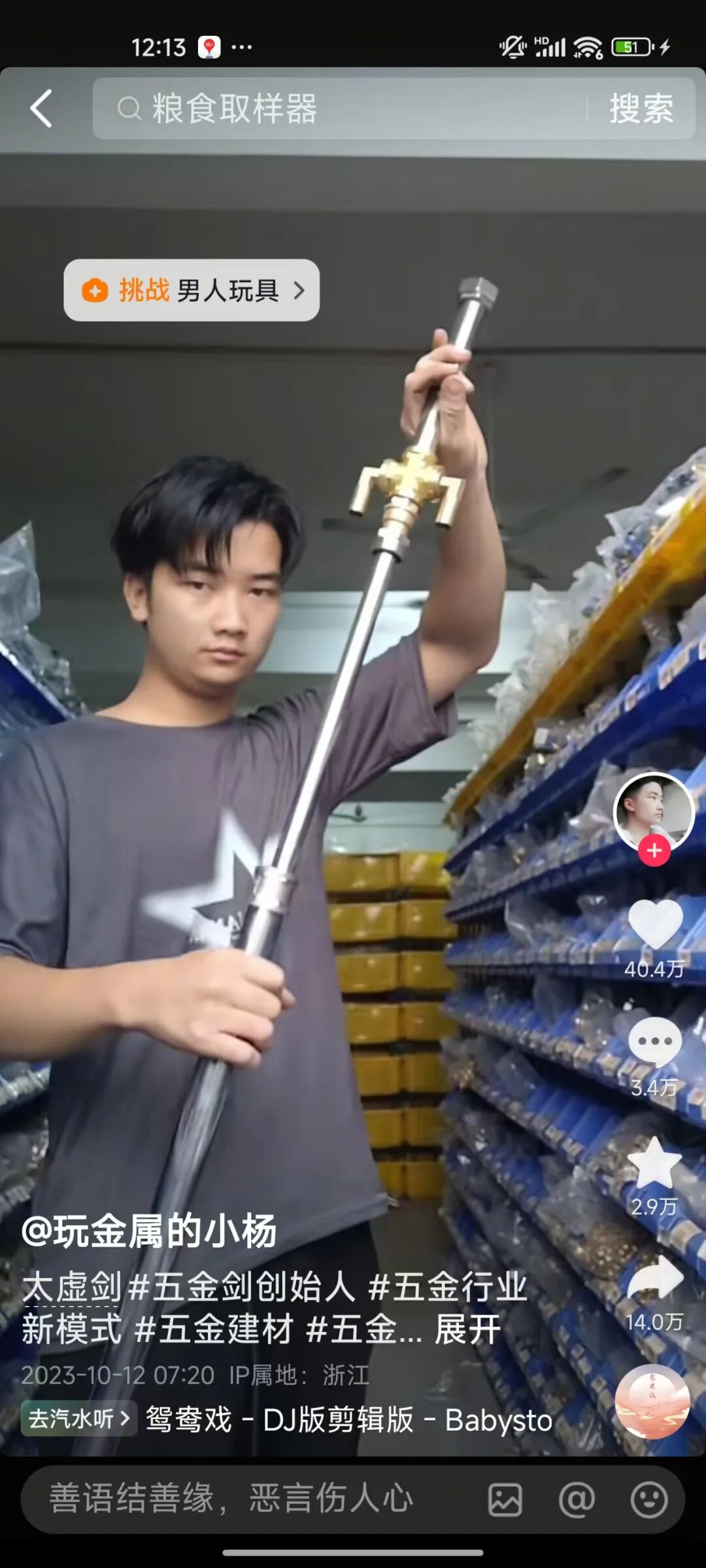 来自浙江的 “玩金属的小杨”,凭借一系列组装五金标准件的视频意外走红。截至8月,其 2023年10月发布的 “太虚剑” 视频点赞量已高达40.4 万。从“太虚剑”到“昊天锤”、“巴雷特”,这些由螺母、螺帽、金属管等常见五金件拼接而成的“兵器”,凭借硬核质感与极高的还原度,在社交平台引发广泛热议。