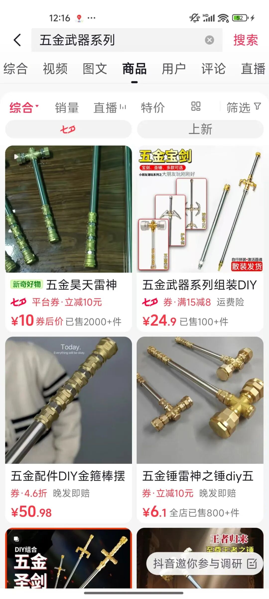 五金店紧跟潮流 据抖音官方数据,杨先生打造的“五金雷神之锤”系列单品在抖音平台单款销量突破2000件,带动相关兵器类目全网销售超500件。这一现象级产品成功激活了传统五金制品的消费场景,催生出“个性化定制武器”的新兴消费模式。