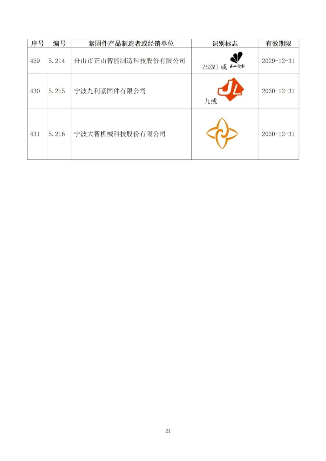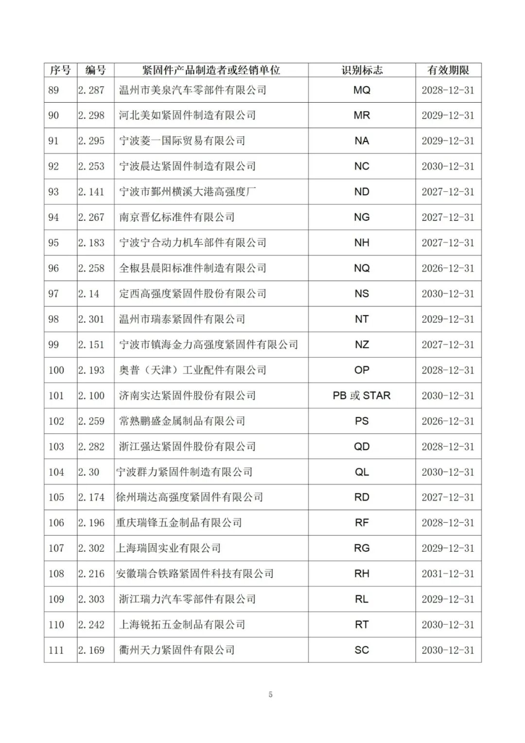 公告发布的均为“使用证书”在有效期内的识别标志。因此,为目测检查紧固件产品质量及企业诚信度提供了最简便的依据。这样,既可杜绝无序生产、防范假冒伪劣产品,又能为保护生产、销售和使用者的权益起到积极作用。望各级市场监管和有关主管部门,以及广大紧固件产品的生产、销售,尤其是使用者予以监督。