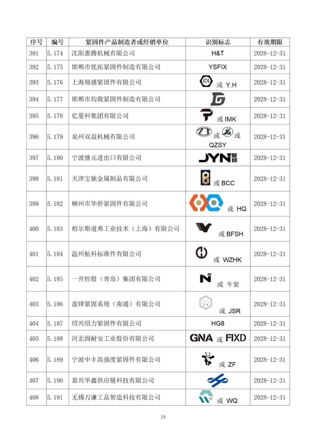 公告发布的均为“使用证书”在有效期内的识别标志。因此,为目测检查紧固件产品质量及企业诚信度提供了最简便的依据。这样,既可杜绝无序生产、防范假冒伪劣产品,又能为保护生产、销售和使用者的权益起到积极作用。望各级市场监管和有关主管部门,以及广大紧固件产品的生产、销售,尤其是使用者予以监督。