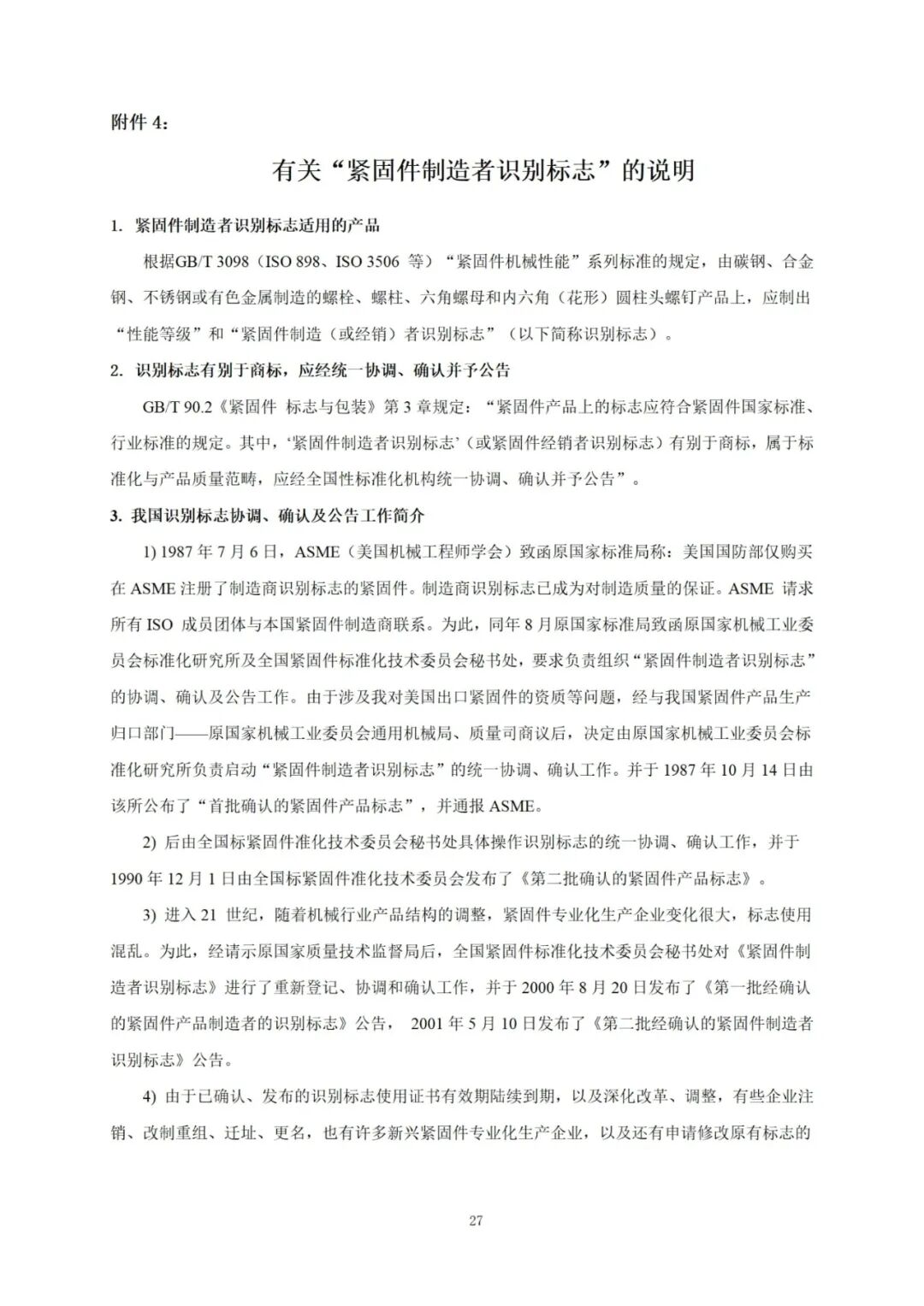 为此,同年8月原国家标准局致函原国家机械工业委员会标准化研究所及全国紧固件标准化技术委员会秘书处,要求负责组织“紧固件制造者识别标志”的协调、确认及公告工作。